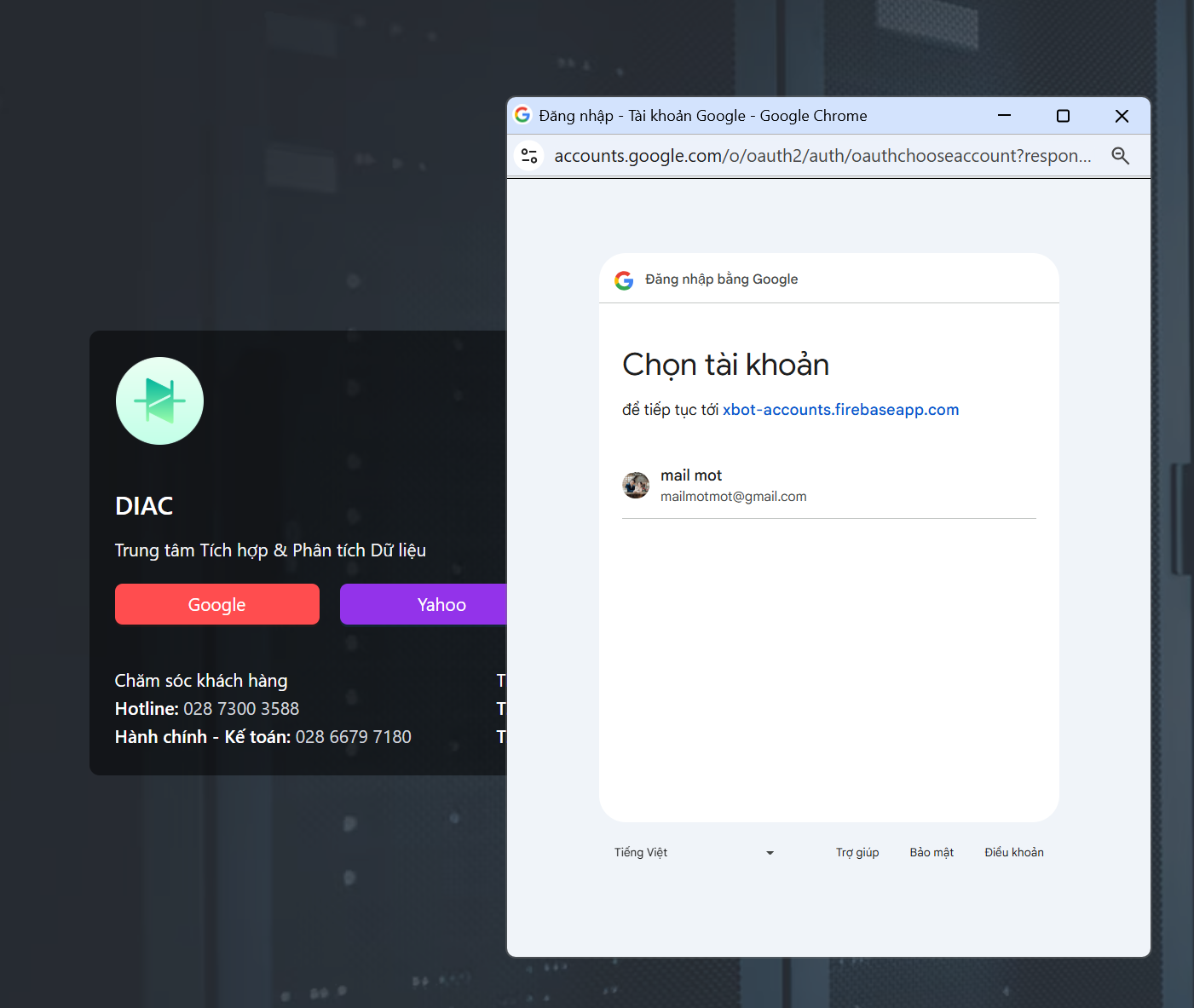 Bước 1: Mở trình duyệt Google Chrome hoặc Cốc Cốc sau đó nhập đường dẫn phần mềm DIAC: diac.xbot.com.vn sẽ ra giao diện như hình dưới: