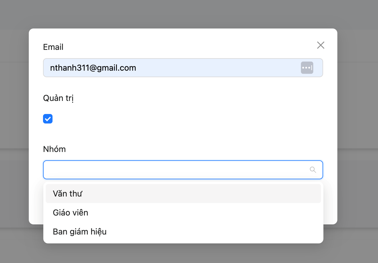 - Chọn quản trị: Nếu người dùng đảm nhiệm vai trò quản trị. Lưu ý quản trị có toàn quyền nên khi chọn quản trị. Người dùng không cần chọn user thuộc nhóm.